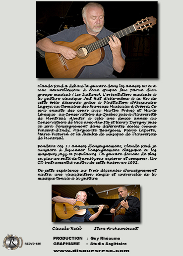 Claude Reid a débuté la guitare dans les années 60 et a tout naturellement à cette époque fait partie d’un groupe musical (Les Sultans). L’orientation musicale à la guitare classique s’est fait d’elle-même à la fin de cette folle décennie grâce à l’initiation d’Alexandre Lagoya au Domaine des Jeunesses Musicales à Orford. Ce sera ensuite des cours avec Martin Prével et Marie Lévesque au Conservatoire du Québec puis à l’Université de Montréal. Ajouter à cela une douce année au Conservatoire de Nice avec Ako Ito et Henry Dorigny puis ce sera l’enseignement dans différentes écoles comme Vincent-d’Indy, Marguerite Bourgeois, Pierre Laporte, Marie-Victorin et la faculté de musique de l’Université de Montréal.